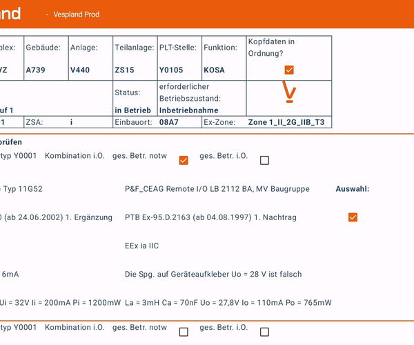 Auch Geräte ohne QR-Code oder RFID-Tag können in die Anwendung aufgenommen werden. Dies ist über das integrierte AssetCollector Tool möglich. Dieses Tool ist ein Bestandteil der App, der die Datenerfassung und -verwaltung auf eine neue Ebene hebt. Entwickelt wird der AssetCollector durch die TUEG Schillings GmbH in Zusammenarbeit mit der Setin GmbH. Das KI-Werkzeug hilft dabei Typenschilder im Feld mit einem Ex-Handy zu Fotografieren und die enthaltenen Daten automatisch in eine Datenbank zu übertragen. Dieses Werkzeug wurde in Zusammenarbeit auch in Vespland Mobile integriert und ermöglicht so die automatische Extraktion relevanter Informationen aus einem aufgenommenen Foto. Sobald ein Typenschild fotografiert wird, erkennt der AssetCollector automatisch Informationen wie Hersteller, Seriennummer, Typ und ATEX-Nummer. Dies minimiert den manuellen Aufwand und erhöht die Genauigkeit der erfassten Daten. Die erkannten Informationen werden direkt in die Anwendung eingegeben, wodurch der Inventarisierungsprozess erheblich beschleunigt wird. Dies gewährleistet eine konsistente und fehlerfreie Datenverwaltung.